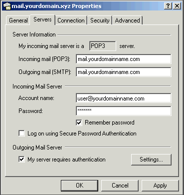 - Incoming Mail server (POP3): mail.domainname.xyz